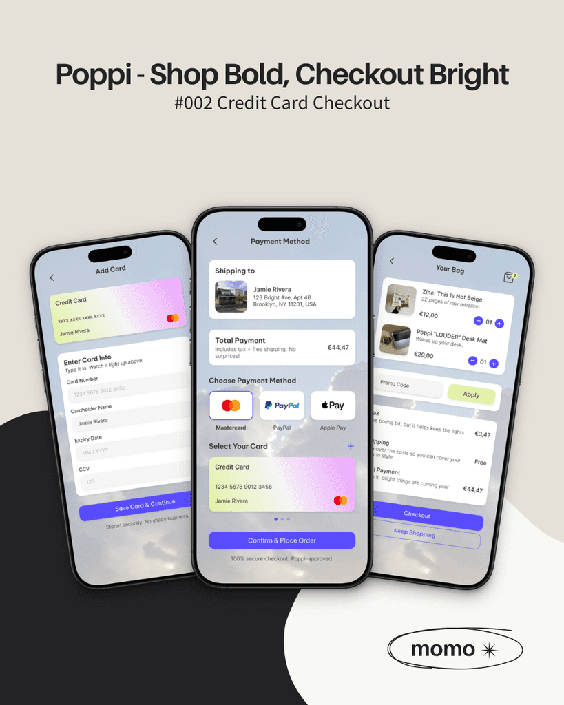 Voor deze oefening ontwierp ik Poppi, een minimalistische en gebruiksvriendelijke checkout-ervaring voor een e-commerce merk. Het ontwerp is strak en overzichtelijk, met een vlotte, persoonlijke en lichte winkelflow.
