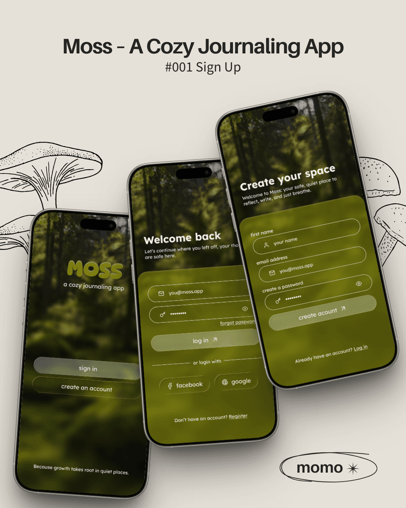 Voor deze oefening ontwierp ik een minimalistisch aanmeldscherm voor een fictieve journaling app: Moss.