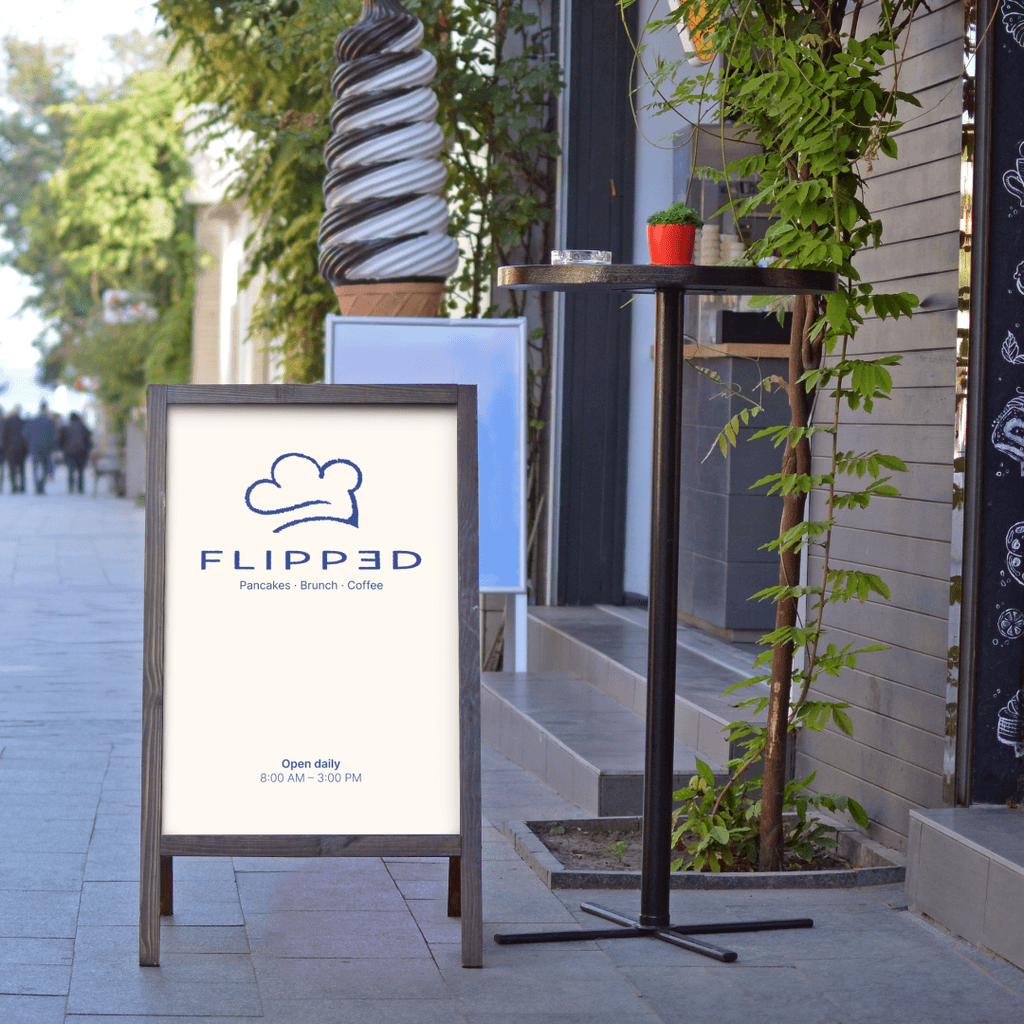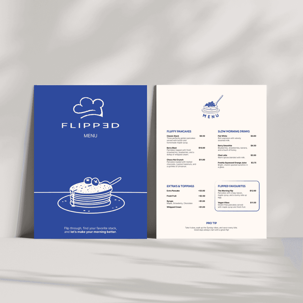 Voor FLIPPED, een nieuw pannenkoekenrestaurant dat zich richt op jongvolwassenen en liefhebbers van uitgebreid brunchen, is een complete huisstijl ontwikkeld. De identiteit moest de warme, gastvrije sfeer van de zaak overbrengen en uitnodigen tot ontspannen, lange ochtenden. Het doel was om een herkenbaar en professioneel geheel te creëren dat aantrekkelijk is voor zowel bezoekers als voorbijgangers.